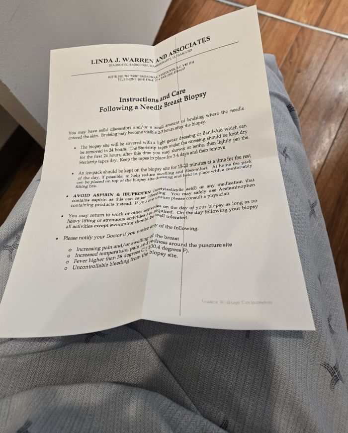 The biopsy was easy. If you have to get one, it’s not bad. But you may be sent home with a bag of frozen peas to tuck into your bra, as you’ll need to ice the area on and off for the rest of the day. If you plan to return to your workplace after, that might make things a bit awkward!